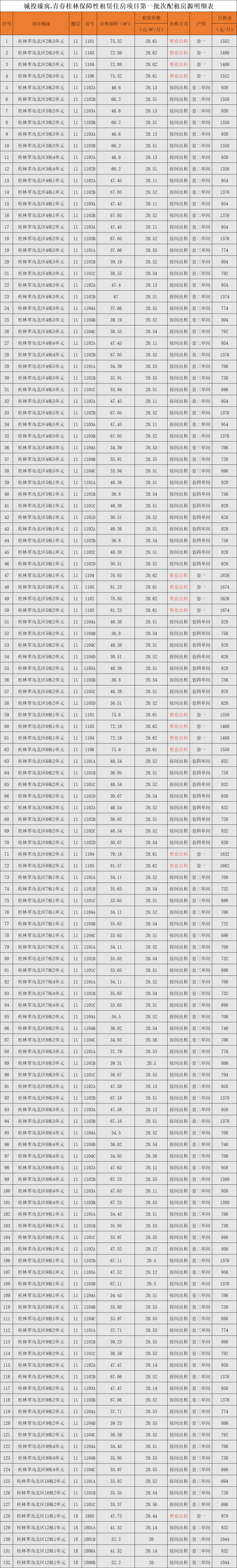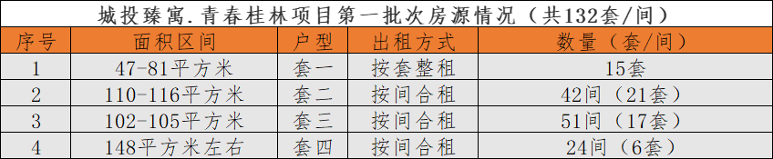 城投臻寓.青春桂林项目(即桂林萃岛保障性租赁住房)位于桂林东路1号,为小高层电梯楼房,房源呈分散式。第一批次配租房源共132套(间),其中整套出租房源15套,按间出租房源117间,总面积 6190.3平方米。