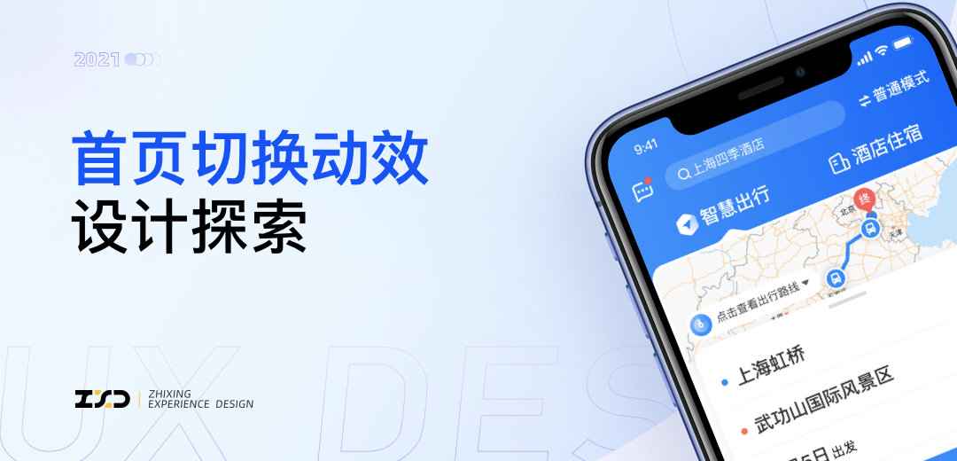 我们设置了一个消失点。在转场开始时,火车、飞机、汽车图标同时向左移动,在消失点完成合并消失,随后,智慧出行图标立即从消失点出现。