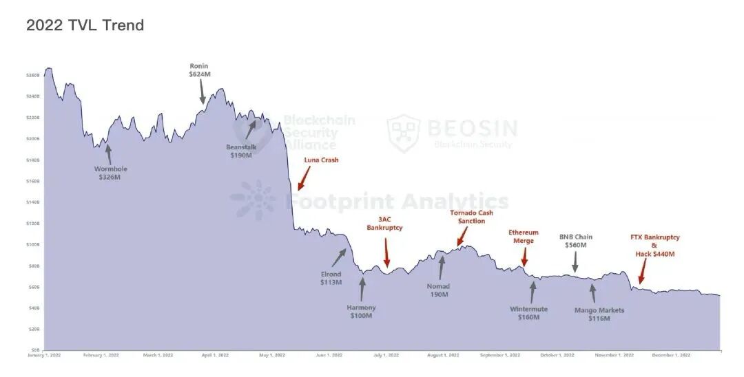 2022全球加密货币市场市值大幅缩水,年底TVL较年初高峰时期下降了约80%。市场遭受重创,出现了以三箭资本、Luna、FTX为代表的一系列黑天鹅事件。