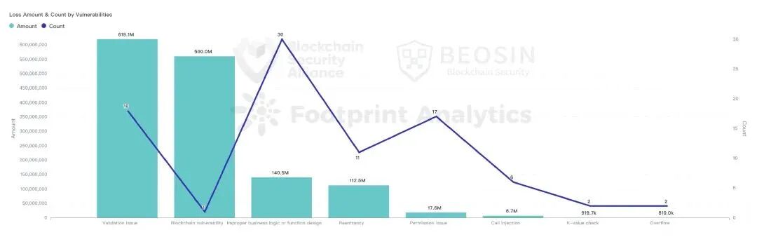 按照漏洞类型细分,造成损失最多的前三名分别是验证问题、链平台漏洞(BNB Chain事件)和业务逻辑/函数设计不当。