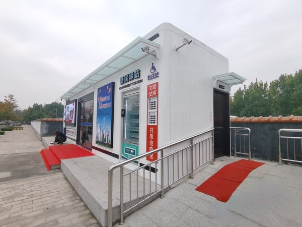 这座公厕外观时尚,外面设有便民驿站、共享充电宝、公益广告显示屏等设施设备。公厕外面南侧位置还有残疾人专用的无障碍卫生间,设有无障碍通道及自动感应器。厕门平时关闭,坐轮椅的残疾人行至门口无需费力开门,只需冲着感应器挥挥手,厕门就会自动开启。