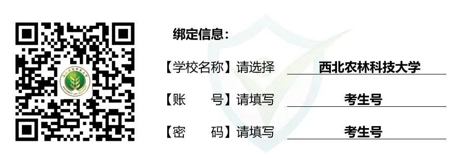 1.手机端学习平台入口:请扫描下方二维码关注微信公众号“平安西农”,点击菜单【平安校园】—【安全微课】—【开始学习】—输入学校名称、账号、密码,点【登录】绑定信息,点击平台首页的【新生安全教育】进行安全微课的学习、考试。