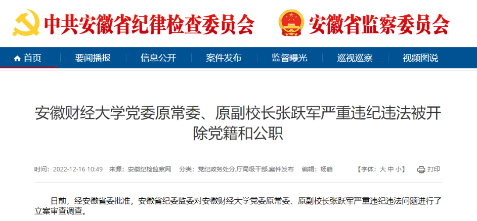 2022年12月,经安徽省委批准,安徽省纪委监委对安徽财经大学党委原常委、原副校长张跃军严重违纪违法问题进行了立案审查调查。