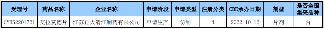 根据药渡数据调研,目前江苏正大清江为国内首家申请艾拉莫德片仿制申报。