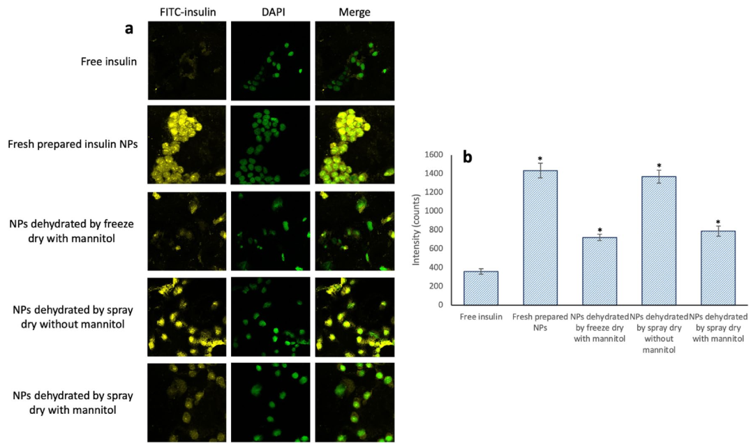 最后,HepG2细胞被用来评估采用冷冻干燥和喷雾干燥方法脱水的NPs的细胞吸收情况。结果表明,封装的胰岛素比游离的胰岛素在细胞吸收方面有更高的功效,这主要与研究中创建的胰岛素负载NPs的尺寸较小有关(图5)。