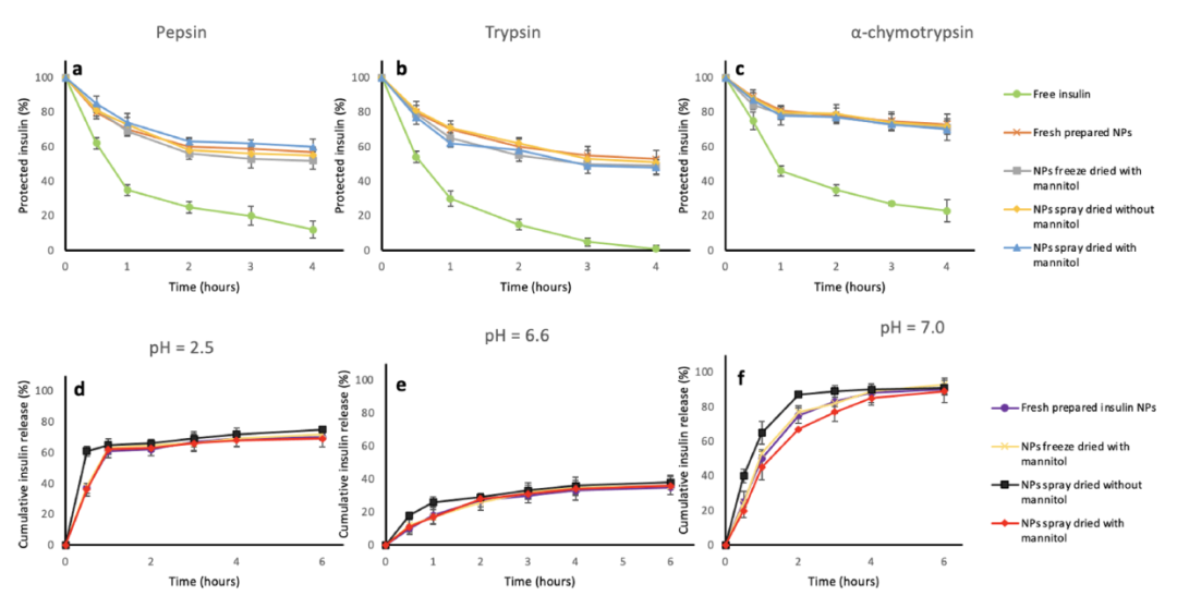 随后,该研究评估了胰岛素NPs的释放效果。结果显示,游离胰岛素在所有三种酶处理中都显示出在4小时内快速消除胰岛素(图4a-c)。相比之下,用甘露醇冷冻干燥的NPs和用或不用甘露醇喷雾干燥的NPs的胰岛素消除试验显示,这些NPs对酶消化的保护作用明显较高,这与新鲜制备的胰岛素NPs相似(图4a-c)。这些结果表明,使用或不使用甘露醇的喷雾干燥和使用甘露醇的冷冻干燥可以保持NPs脱水后的胰岛素保护能力。