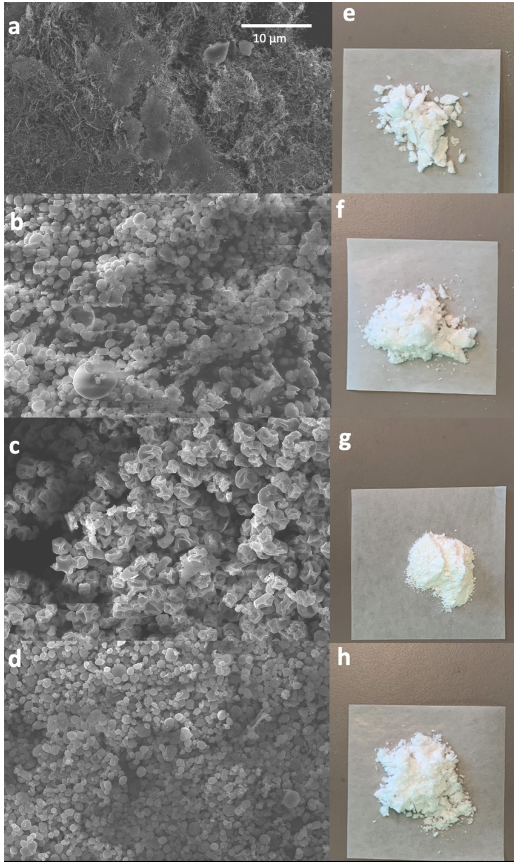 图2. 不同脱水胰岛素NPs的形态。(a) 不含甘露醇的冻干胰岛素NPs的SEM图像;(b) 含甘露醇的冻干胰岛素NPs的SEM图像;(c) 不含甘露醇的喷雾干燥胰岛素NPs的SEM图像;(d)含甘露醇的喷雾干燥胰岛素NPs的SEM图像。(e) 不含甘露醇的冻干胰岛素NPs粉末的图像;(f) 含甘露醇的冻干胰岛素NPs的图像;(g) 不含甘露醇的喷雾干燥胰岛素NPs粉末的图像;(h) 含甘露醇的喷雾干燥胰岛素NPs的图像。