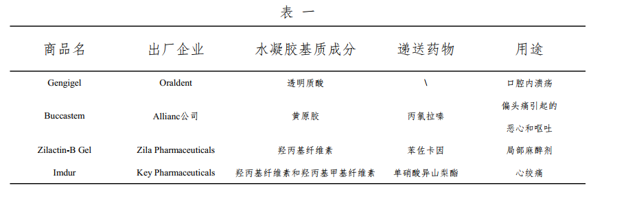 水凝胶独特亲水、三维结构,使得分子和细胞可以扩散和附着的特性,通过不同的交联方法,使得水凝胶具有了温度、浓度或外环境的刺激响应性,最终这些特性可以广泛应用于药物递送,使得水凝胶作为药物载体发挥着重要作用。在本段中,主要介绍基于水凝胶递送的药物。水凝胶口腔给药的特点是:易于给药、患者顺应性好,起效迅速、易于移除,刺激或不良副作用的风险低,可以避免药物在胃肠道内降解和首过效应。口腔主要多层上皮组成,根据生理结构大致可以分为口腔底部、脸颊内侧和牙龈,药物在口腔中的递送过程主要经过:药物溶出、药物被动或者主动的方式通过粘膜扩散到局部血液循环系统,最终并到达全身血液循环的过程,因此不同部位的渗透性带来不同的给药方式。舌下黏膜比颊黏膜渗透性高,适用于需要快速起效的药物,但舌下黏膜给药会影响说话期间舌头运动。相反颊粘膜上给药对舌头活动影响小,优选用于治疗慢性疾病,牙龈递送药物往往局限于局部作用。粘膜给药会有很大一部分进入胃肠道,因此在剂型设计考虑具有粘附性的水凝胶。基于水凝胶的生物粘附片可以利用水合作用来控制药物的释放速率。这些水凝胶应用中常用基质有:羟丙基纤维素(HPC)、羟乙基纤维素(HEC)、聚丙烯酸(PA)树脂、羧甲基纤维素(CMC)、聚乙烯醇(PVA)、羟丙基甲基纤维素(HPMC)、壳聚糖等。目前市场的水凝胶药品,它们的范围从用于口腔护理和补水的水凝胶到用于预防心绞痛的持续给药系统,在下表中列出。![]()