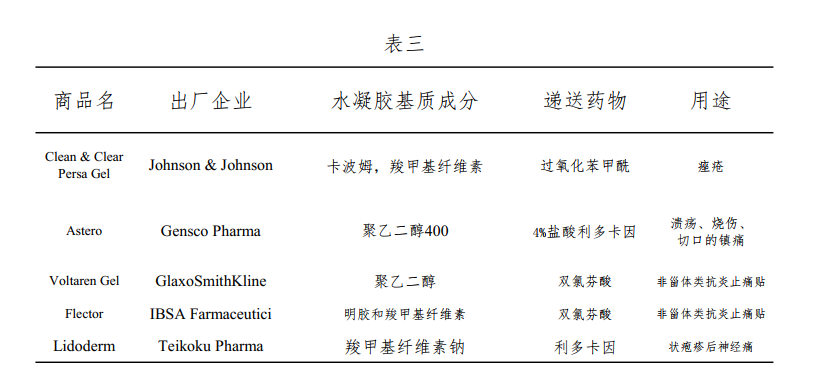 经皮给药是一种特殊的给药方式,适于吸收差、首过效应高的口服药和注射不能耐受的患者。皮肤是一种不均匀的膜,渗透率非常低的特征,可以减少水分流失,阻止毒素流入体。皮肤的最外层是角质层,虽然只有20~25 μm的厚度,可以阻止外来物质的渗透,但也是阻碍经皮给药的最大障碍。常规的透皮贴剂给药需要药物具有低分子量、高亲脂性和剂量小的特点。1979年,美国批准了第一个用于全身给药的透皮系统——东莨菪碱透皮贴。十年后,尼古丁贴剂上市,作为一款重量级的透皮制剂,尼古丁贴剂不仅具有患者依从性高的特点,也大大提高了透皮制剂在患者中的知名度。近年来上市的常规透皮贴剂可分为两大类:储库型贴剂和基质型贴剂。第一种的特点将药物保持在溶液或凝胶中,通过位于药物储存器和皮肤之间的膜来控制药物的输送。后一种是将制剂的粘合性和机械性能相结合,药物输送速率仅仅受皮肤渗透性控制。因而克服皮肤的渗透性就是问题的关键,水凝胶通过保湿作用通过皮肤水合作用促进药物的皮肤渗透,发挥局部和全身的作用。下面列出了市场上一些基于透皮给药水凝胶的商业产品,这些产品的覆盖范围相对较广,从皮肤病到全身给药,均有涉及。