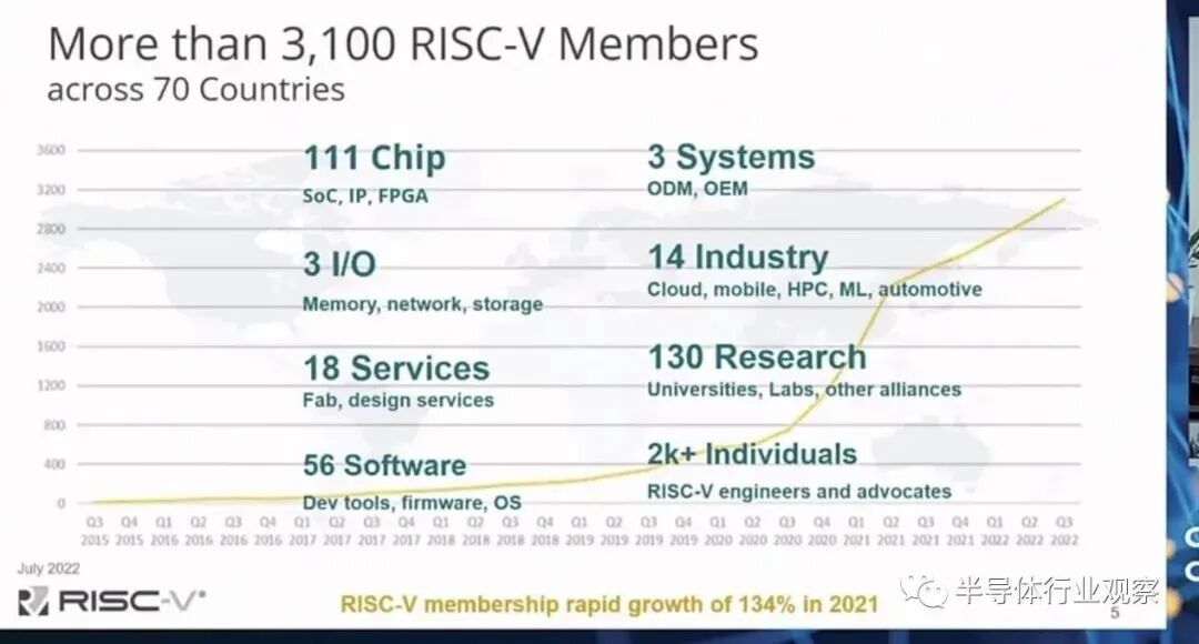 前不久,RISC-V基金会CEO Calista Redmond表示,RISC-V基金会已经在全球70多个国家吸引了超过3100个会员加入,会员数量在2021年暴增了134%。RISC-V产业在过去几年里取得的初步成果,搭载RISC-V内核的芯片出货量已经突破了100亿。
