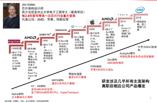 在其20多年的工作经历中,Jim keller先后在DEC、AMD、博通、苹果、特斯拉、Intel等公司任职,一次又一次创造了被认为是芯片行业中,至关重要的领先部件。