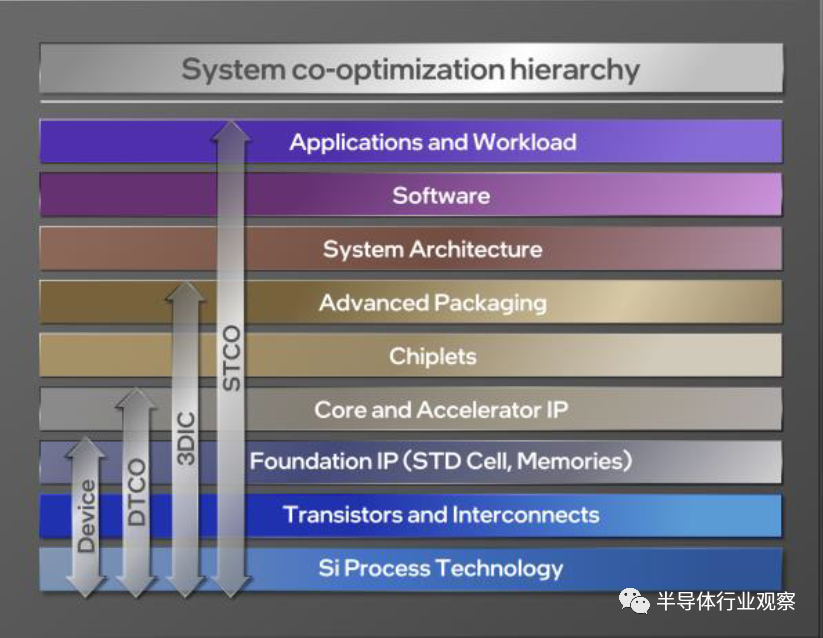 STCO是一个更大级别的功能集成,其中系统的所有单个领域:软件(表现为工作负载)、系统架构、设计工程、IP构建块、由晶体管和互连(加上相关材料)组成的硅片制造、电压调节、异质集成的先进封装、测试和大批量制造都经过了共同优化,以创造出能够支持客户创新和应用的产品。从本质上讲,我们可以将STCO看作是在一个紧凑的封装中组装了许多曾经存在于整个主板上的技术。STCO从整合系统的全部功能开始,然后共同优化每个组件。STCO依赖于在系统的各个领域(硬件和软件)的持续进步,同时整体协同优化。图3是通用计算系统的STCO所涵盖领域的说明。历史规范大多跨相邻层进行了联合优化,如图4中的硅技术和基础IP。图4说明了器件优化、DTCO、3DIC和STCO之间所涵盖的领域的差异。