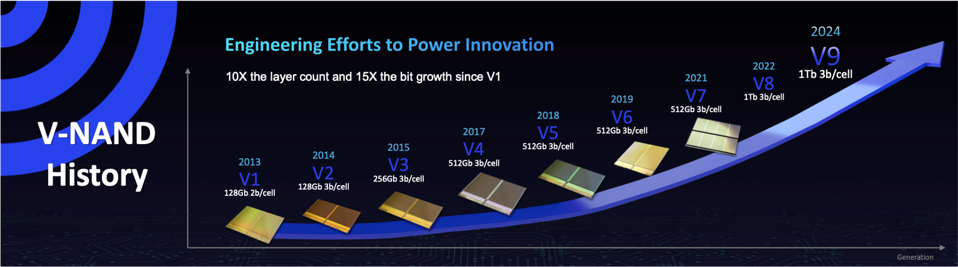 三星已经生产到了第八代V-NAND产品,层数大约是230层。三星表示,其第9代V-NAND正在研发中,预计2024年量产。到 2030 年,三星相信他们将在其 V-NAND 产品中创建超过1,000层。下图为三星V-NAND产品进展情况。