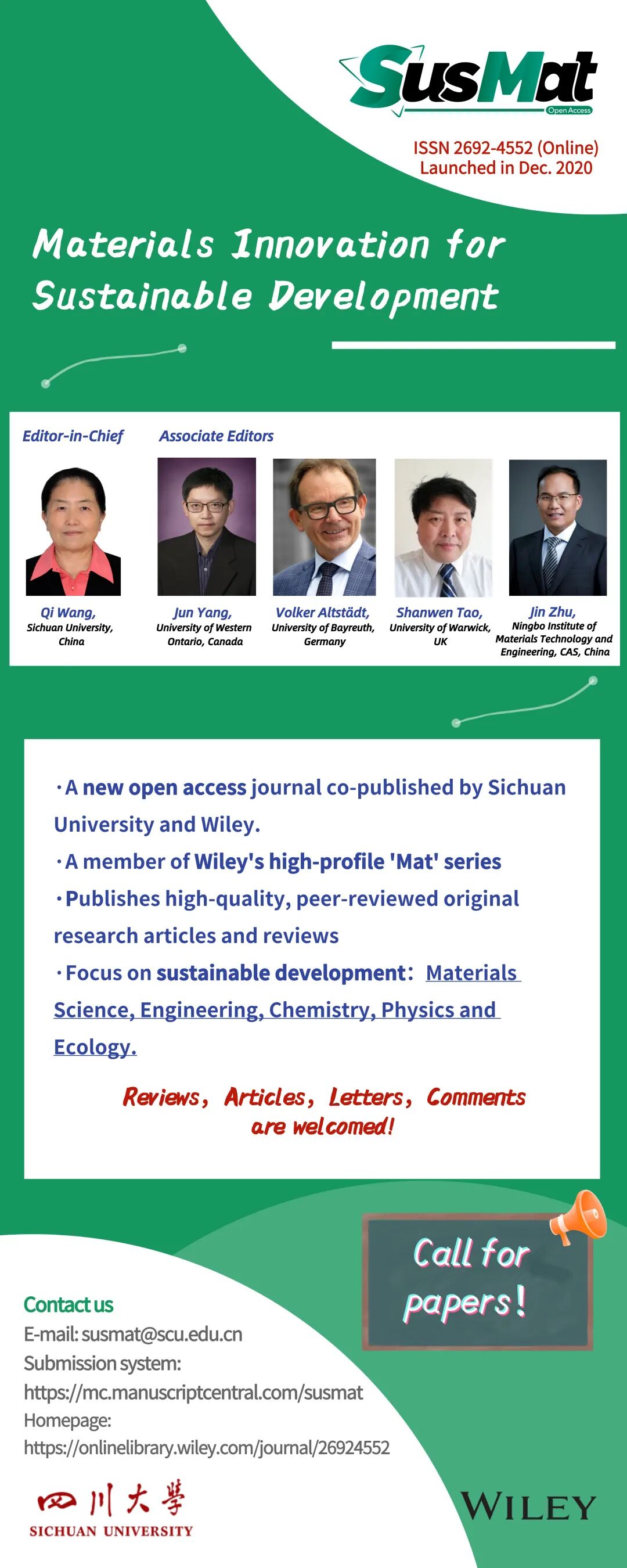 作为“Mat”期刊系列的新成员,《SusMat》(Sustainable Materials缩写)关注和报导可持续发展材料领域的前沿和热点研究进展,涵盖