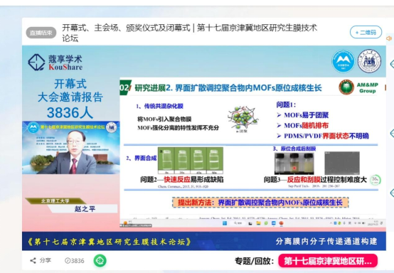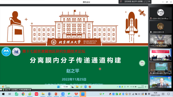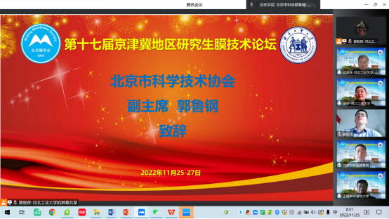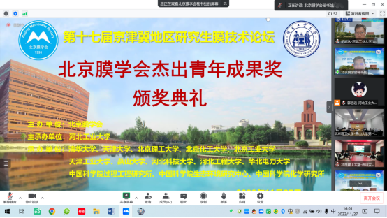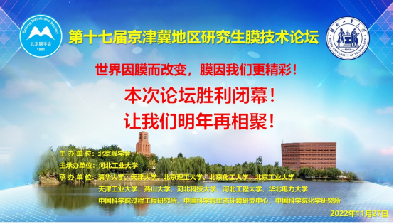 由北京膜学会主办,河北工业大学主承办,清华大学、天津大学、北京理工大学、北京化工大学、北京工业大学、天津工业大学、燕山大学、河北科技大学、河北工程大学、华北电力大学、中国科学院过程工程研究所、中国科学院生态环境研究中心、中国科学院化学研究所共同承办的“第十七届京津冀地区研究生膜技术论坛”,于2022年11月25日至27日成功举办,论坛以线上+线下相结合方式(“腾讯会议+蔻享学术”并行直播)召开。