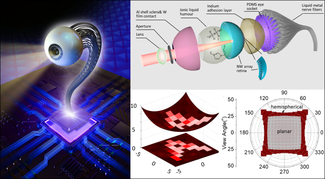 眼睛是心灵的窗口,古人云“一寸秋波,千斛明珠觉未多”。实际上对于地球上的绝大部分生物来说,眼睛都是最重要的传感器官,尤其是人类,大约80% 的环境信息都是通过眼睛获取。人眼视场宽,分辨率高,对光高度敏感,是当前任何相机都无法比拟的。人眼优势来源于半球形的视网膜和高密度的视细胞。模仿这些特点来创造人工仿生眼意义重大,既可以帮助病人恢复光明,也可以用于类人机器人。但是当前商用的电荷耦合器件(CCD)和互补金属氧化物半导体(CMOS)图像传感器,主要通过主流平面微加工工艺成型,很难做成人类生物视网膜那样的半球形。因此研制与人眼功能相当的仿生眼是项极具挑战性的工作。