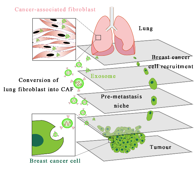 A multi-layer paper supported co-culture system was developed for investigation of exosomes mediated interactions between breast cancer cells and lung fibroblasts from both temporal and spatial aspects.