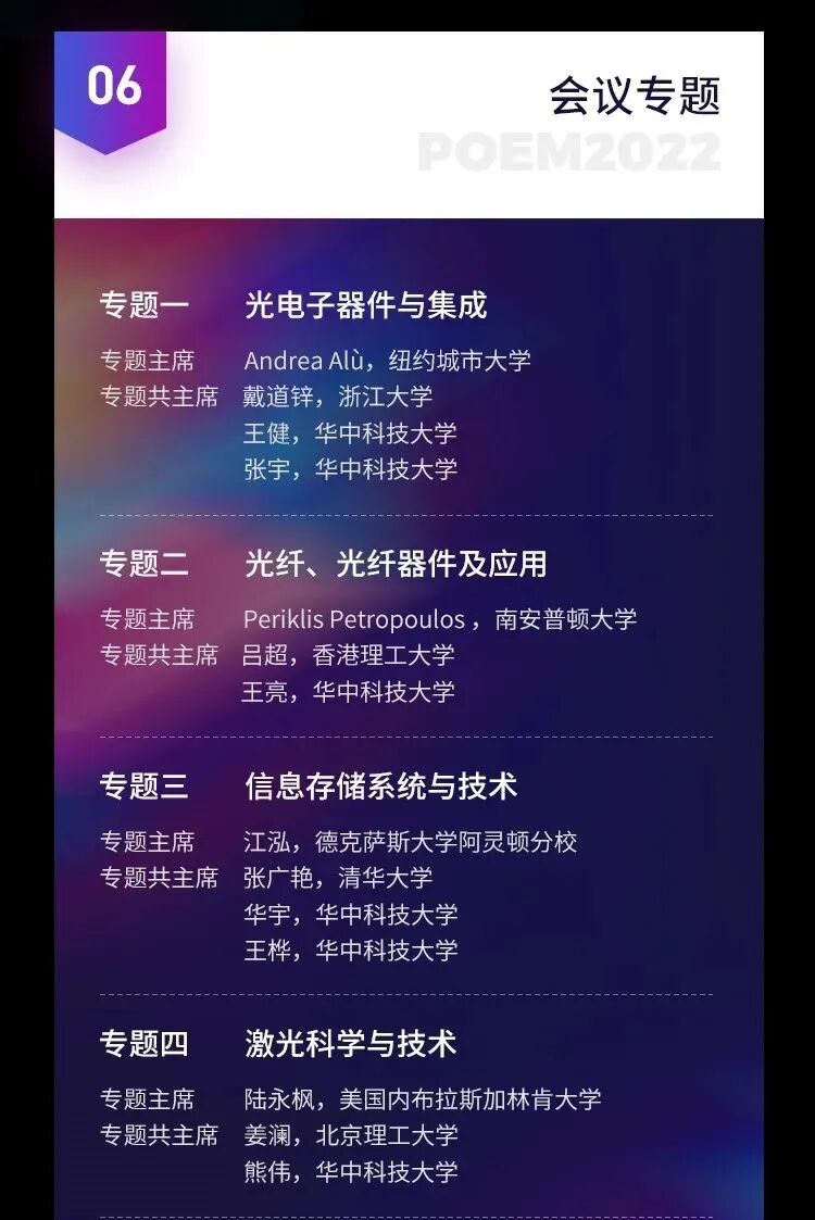 本年度POEM将于10月28-30日在武汉光谷华美达酒店举行,由武汉光电国家研究中心和湖北光谷实验室联合承办,国际光学工程学会(SPIE)提供出版支持,共组织七大专题会议。会议摘要投稿系统已开通,截止日期为2022年9月23日。
