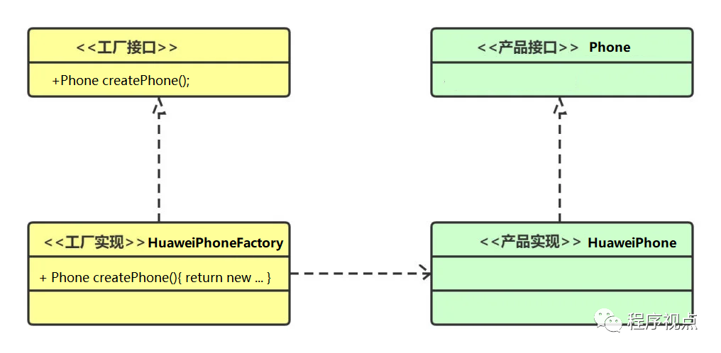 怎么是个接口呢?只有抽象方法的类,当然可以声明为接口呀!产品类工厂:“HuaweiPhoneFactory”和“ApplePhoneFactory”