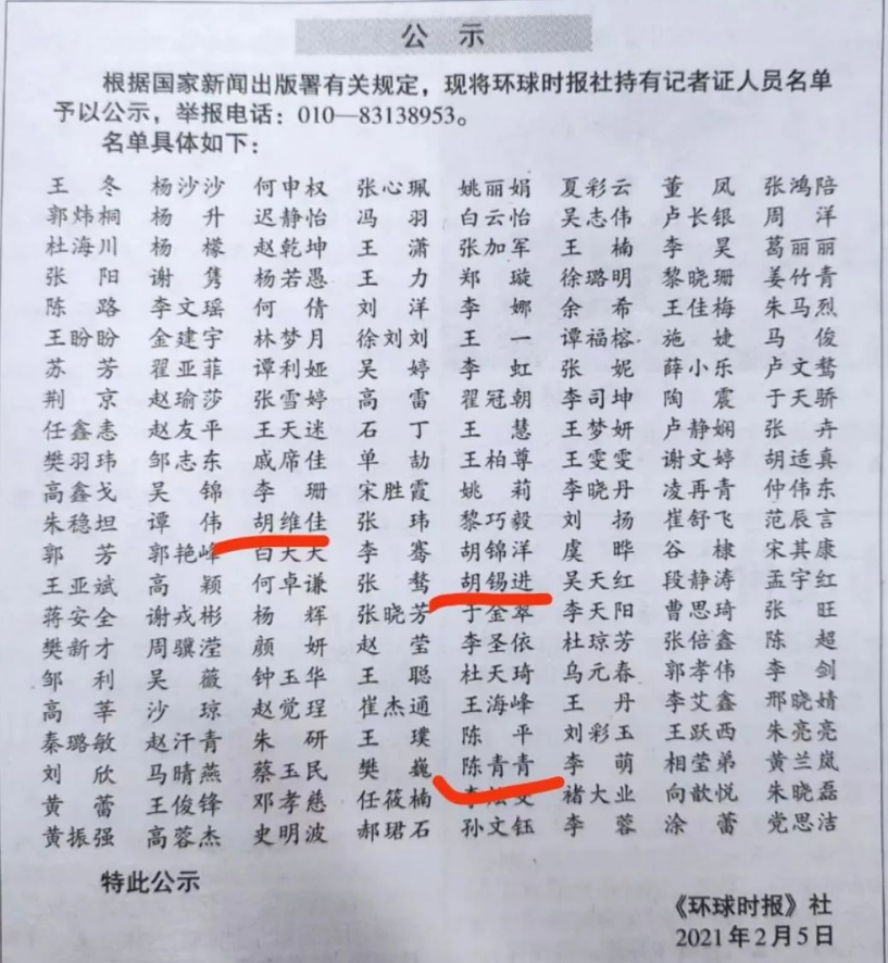 21年环球时报公布了该报记者名单,胡锡进和其女儿都在名单内,付国豪不见踪影。