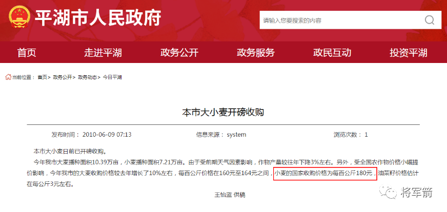 就这,都是近年来难得的高价了。从一份2010年浙江嘉兴平湖市的公告中可以看出,即使是东部发达地区,在2010年的小麦收购价也只有0.9元/斤。