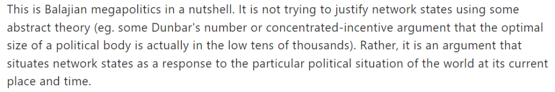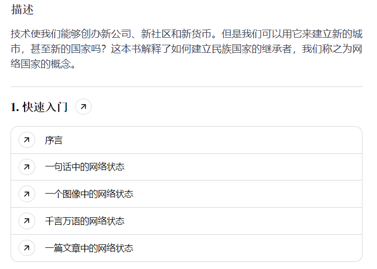 本文约5769字,阅读约需要15分钟。声明:出于微信公众平台审核要求,本文将跳过Vitalik的《What do I think about network states》一文中的部分举例和引用,但其结论性表述不受影响。有兴趣的读者可以自行到原文查看。原文链接如下。https://vitalik.ca/general/2022/07/13/networkstates.html一 巴拉吉的书《The network state与其说这是本书,不如按照巴拉吉自己都在序言里承认的那样,这更像是一本动态的网页集合,每一个章节都是单独的网页,因此任何人可以随意地引用或单独阅读其中的一小部分,并随时动态地查看最新版本。《The network state》网页版目录(机翻,“状态”应为“国家”)在Vitalik的文章和这本书的开始,他们都在关注“网络国家”的定义,尽管他们可以对网络国家所必备的一些基础概念达成共识,但精确地描述网络国家的细节仍然是很复杂的。在最开始,巴拉吉给出了一版简洁的基础定义。