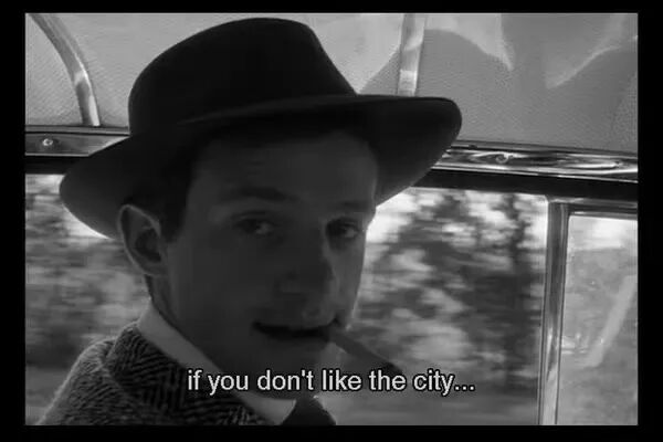 戈达尔在《筋疲力尽》《狂人皮埃尔》中引用新人让-保罗·贝尔蒙多,将一位具有冒险精神的虚无主义者的面貌深深印刻在胶片上。在黑色电影的故事结构上,注入属于戈达尔独特的影像实验:跳接,打破第四道墙,甚至将简·赛伯格的侧面特写镜头分切为9次之多的跳接,一段流动的影像被还原为瞬时之帧。他不断以革命的力度改变电影的形态,让影像成为漂浮在海面上层层叠叠的叶子,每一片都脉络清晰,每一片和另一片没有紧密的联系,同时依偎在一起。
