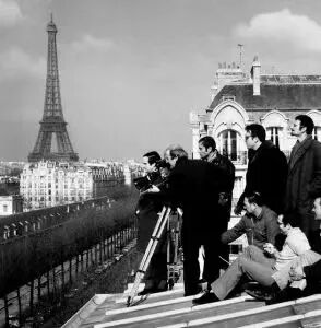 雷蒙·科谢捷为新浪潮拍下了不少珍贵的影像记录。上图为拍摄《偷吻》,特吕弗及剧组踏上了巴黎的屋顶;下图为摄影师库塔尔因戈达尔拒绝使用轨道而坐上轮椅拍摄《筋疲力尽》。