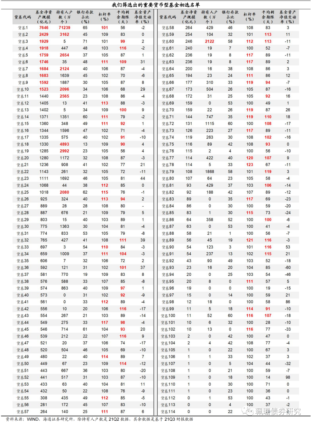 其三、市场影响偏小,整体影响或较为温和。若按初选名单来看,规模占比高达71%,其中杠杆率不满足要求的产品规模占比达到15%、平均剩余期限不满足要求的规模占比达到19%。但考虑到,投资者数量、基金规模是初评指标,满足二者之一是纳入参评范围,最终名单是证监会综合四个指标(包括但不限于)进行评估后并确定名单。也就是说规模越大、关联度越高、可替代性越强、复杂性越大的更可能被列为确定名单。因此,我们从单只基金规模或投资者数据量来看,若前十大基金确定为重要货基,其合计基金净资产规模占市场总规模比重为31%,其中杠杆率、平均剩余期限不满足要求基金规模占比分别为3%、6%。此外,货基1的基金资产净值高达7646亿元(21Q3),投资者数量也高达71239万人,若被确定为重要货基,则需要在3个月内满足投资组合平均剩余期限不得超过60天以及不能加杠杆的要求等,截至21Q3该产品杠杆为101%、平均剩余期限为56天,分别略高出监管要求1个百分点、满足监管要求。总体来看,整改压力较为温和。4.对债市有何影响?