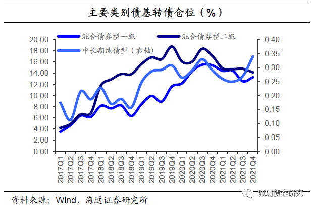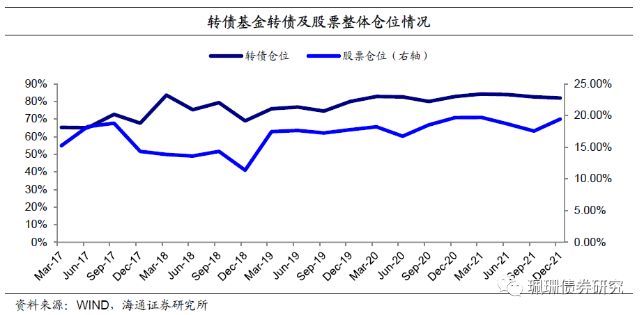 转债仓位继续降低,但不同基金分化。21Q4转债基金配置可转债526.9亿元,环比21Q3上升106亿元,整体来看转债持仓占基金净值的比重为81.98%,环比21Q3降低0.7个百分点。从只数来看,17只基金21Q4转债仓位提升,22只下降。
