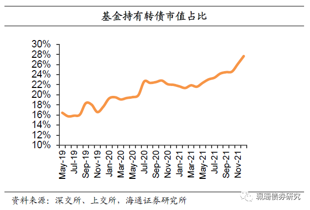 基金持有转债市值占比继续提升,年末持仓市值增幅明显。截至21年12月末,沪深两市转债投资者中,基金持有市值占比约27.7%,较三季度末继续提升3.2个百分点。四季度基金转债持有市值明显增加,其中11、12月增加较多,分别为188.8亿元、161.71亿元,也是近几年增幅较大的月份。