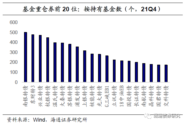 21Q4除了大盘底仓品种外,新能源、电子及周期转债等持有基金数较多,行业分布相对更均衡。从行业来看,除了传统底仓选择外,持有基金数较多的品种,主要在景气度较高的新能源如运营类的晶科、节能、福能,车相关的三花、中鼎,以及盛虹等;电子相关的立讯、国微、韦尔;此外低估值周期类也有布局,例如交科、海亮、本钢、靖远、旺能、山鹰等。
