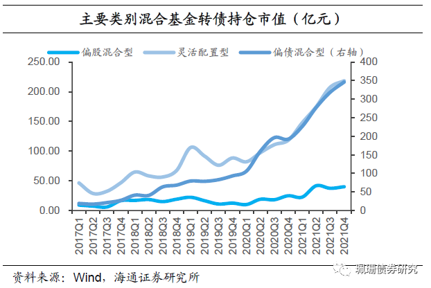 转债基金规模上升。21Q4转债基金(名称中带转债,剔除被动型以及新成立基金,共39只)资产净值共计642.7亿元,环比21Q3增加133.85亿元。其中鹏华可转债、汇添富可转债、广发可转债、前海开源可转债、南方昌元可转债等规模有较明显增长。
