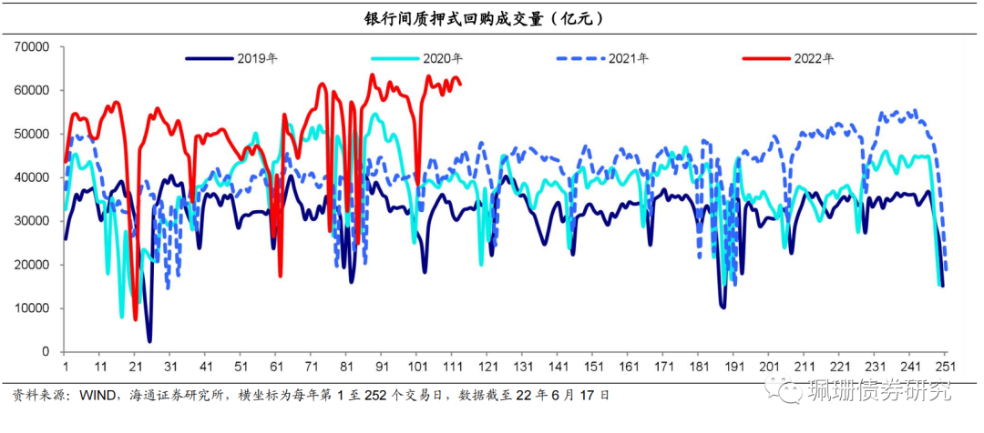 (5)上周,从回购成交量来看杠杆大幅回升,质押式回购成交量位于历史高位。从市场总的质押式回购成交情况来看,上周机构杠杆大幅回升,日回购成交量均在5.98万亿元以上。质押式回购成交量周度均值约6.18万亿元、再创历史新高,隔夜回购成交量占比均值环比回升至89%。