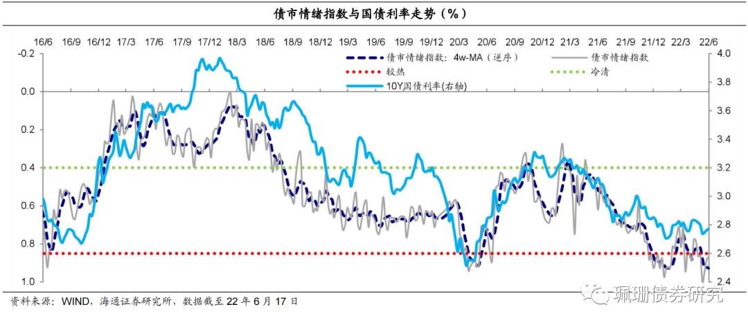 (1)上周(6月13日至6月17日,下同)债市情绪指数(4周-MA)略微回升0.004至0.93、已略高于1月末高点约0.002(高出上临界线水平约0.077),单周指数继续回落(我们的数据区间从2016年开始)。从历史跟踪效果来看,平滑后的指数跟踪效果更好。此外,情绪指数是基于两年滚动分位数构建,因此2020年3-5月的情绪高点是不包含在内的。![]()