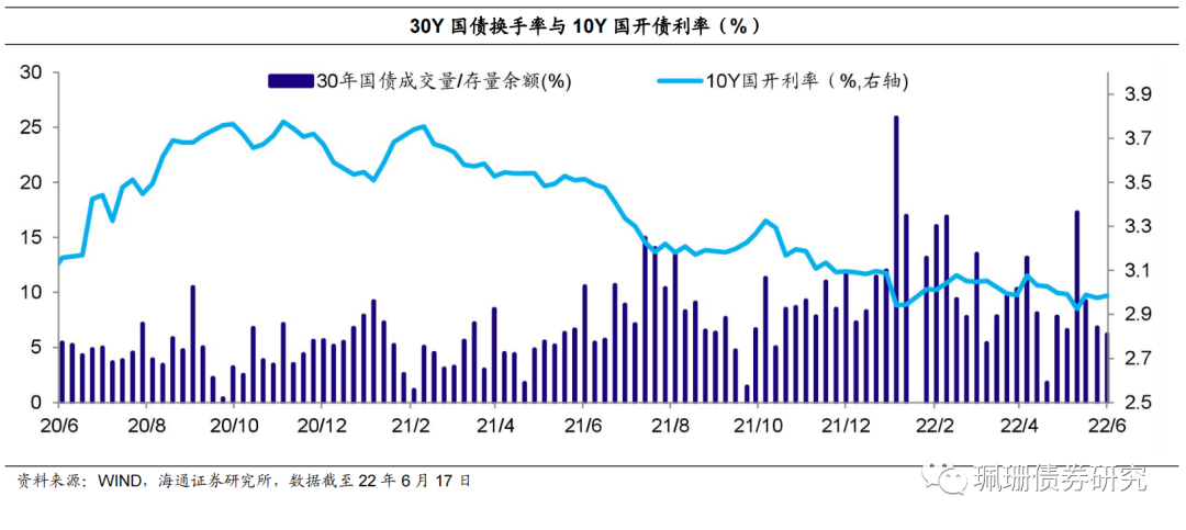 (2)三十年国债换手率:上周超长债交投情绪继续回落。30年国债成交量/存量余额占比来看,上周三十年国债成交量占比6.2%、相较于前一周环比下降6.3个百分点,处于近三年以来54%分位数,显示超长债交投情绪偏低。