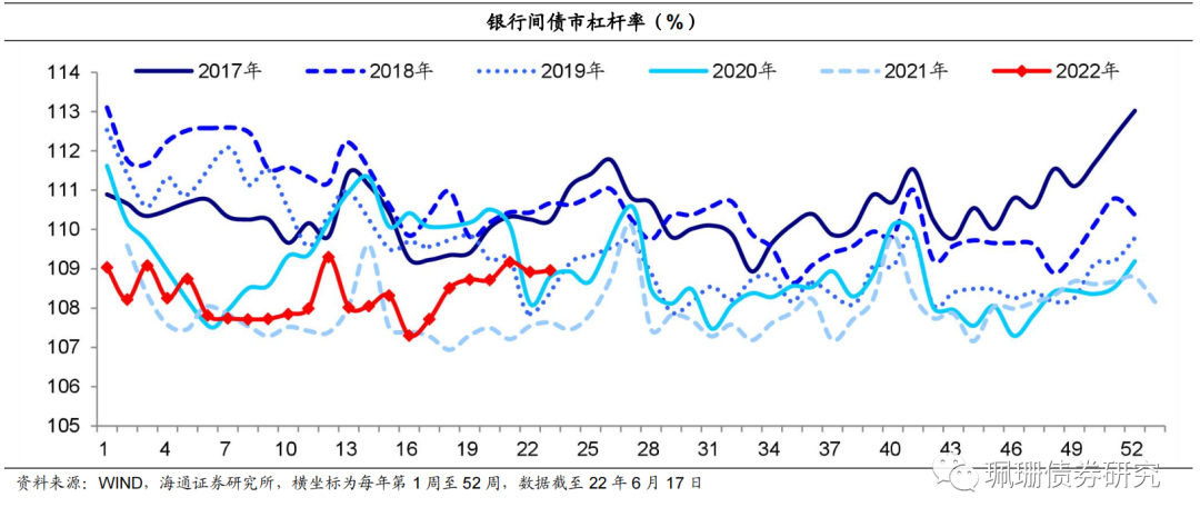 (6)上周,银行间杠杆率回升。至6月17日当周银行间债市杠杆率为108.9%,环比转为上升0.04个百分点、同比继续上行1.3个百分点。