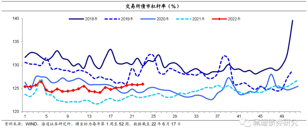 (7)从交易所债市杠杆率来看,上周交易所杠杆率小幅回升、为年内第二高水平。至6月17日当周交易所债市杠杆率为125.9%,环比上行0.17个百分点、同比继续上行2.6个百分点,杠杆率水平为年内第二高、仅次于今年1月28日当周水平。