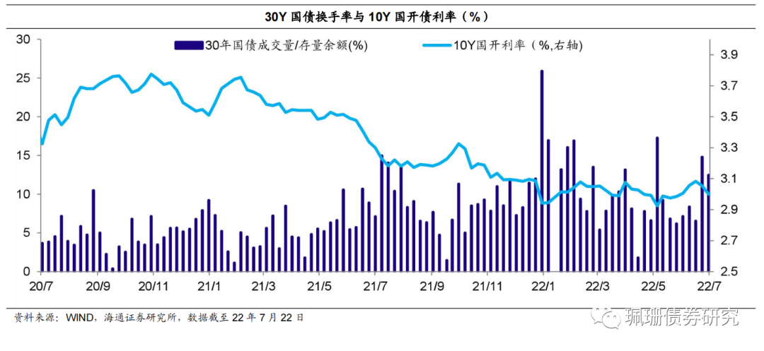 (3)从10Y国开活跃券成交额/9-10Y国开债余额周均值来看,活跃券交投维持降温。至7月22日10Y国开活跃券成交额/9-10Y国开债余额处于近三年以来的94%分位数,周均值环比继续回落1.5个百分点,显示10Y国开活跃券交易情绪持续降温。
