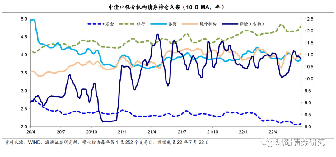 其余主要机构的久期风格大多拉长(中债口径),基金拉久期延续。至7月22日除保险和境外机构的债券持仓久期较7月15日继续缩短0.004年、缩短0.02年至10.8年、4.05年之外,其余的基金、银行和券商的债券持仓久期分别拉长0.03年、拉长0.02年、拉长0.11年至2.11年、4.84年、4.01年。其中银行的债券持仓久期回升、处于近三年以来的99%分位数;基金的债券持仓久期略升但仍偏低、处于近三年以来的5%分位数;保险的债券持仓久期最终持平在近三年以来的75%分位数。
