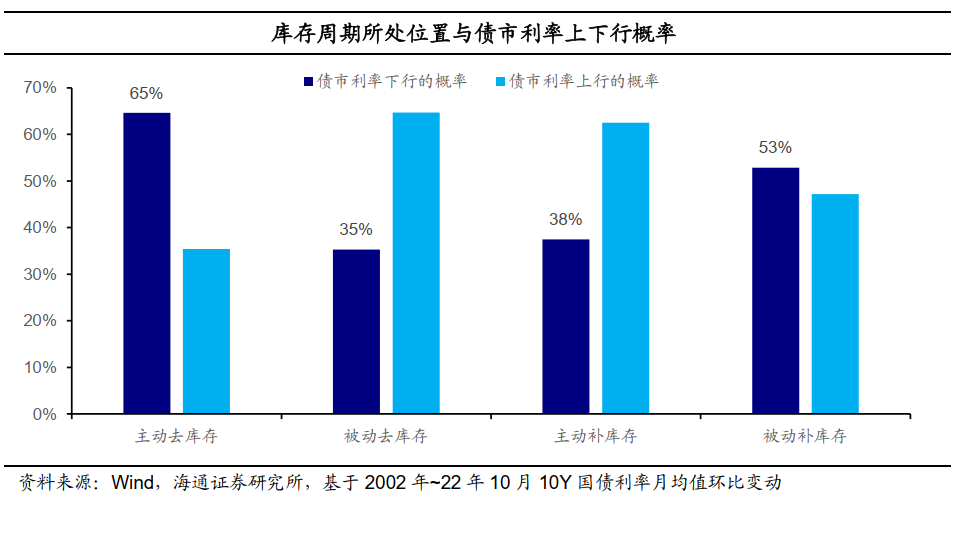 l 当前我国和美国的库存均在去化,短期对债市仍偏利多支撑。与2016年四季度债市熊市相比,16年8月我国补库存周期开启、与美国补库存形成共振;与2019年末相比,中美库存周期错位,我国开启补库存而美国库存去化。l 当库存周期处于主动去化阶段时,债市利率大概率趋于下行、下行概率为65%(基于2002年~22年10月10Y国债利率月均值环比变动)。当库存周期走向被动去化阶段时,债市利率大概率上行、上行概率为65%;以及库存开启主动补库存时,债市利率有63%的概率趋于上行。继续关注1-2Y利率债修复价值