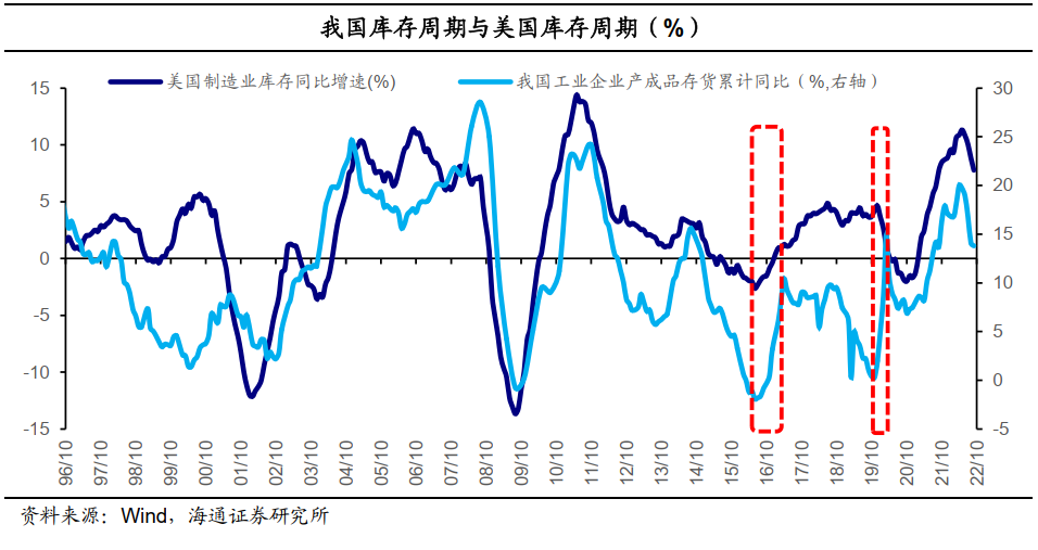 (3)我国库存周期:96年以来,我国先后经历了7轮完整的库存周期(目前正处于第8轮的去库存阶段),波峰分别出现在98年2月、01年6月、04年12月、08年8月、11年10月、14年8月、17年4月、22年4月,每轮库存周期持续时间短则32个月、长则60个月(主要是受疫情冲击影响,库存周期拉长)、平均41.4个月。