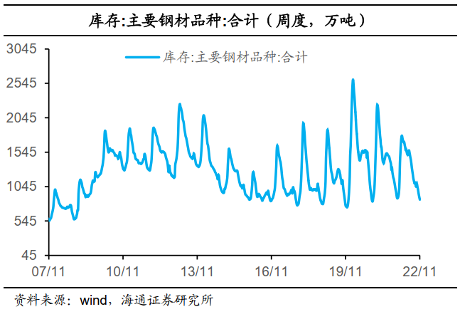(3)水泥库容比环比有所下降、但仍处于历史较高水平。水泥库容比11月25日当周值和11月以来月均值环比均下降,但仍处于历史较高水平(主要是沥青新开工率回落,基建单月投资增速回落,使得水泥库存消耗速度变慢)。随着寒冷天气来袭,叠加春节假期临近,水泥需求和产量均在季节性下降,短期来看水泥库容比或仍将季节性走低,但距离库存出清或仍有很大空间。(4)钢材库存季节性去化、库存处于低位。今年3月下旬以来,主要钢材品种库存持续下降,主要背景是今年基建发力托底经济在一定程度上对钢材需求形成支撑,但钢材需求也受到疫情压制,以及钢材产量整体偏弱。总体来看,钢材库存走势基本符合季节性,只是绝对值处于近年同期较低位置。近期地产积极政策频出,但实际效果有待观察,年末基建项目建设进度或放缓,钢材库存消耗速度或放慢。3. 何时有望开启补库存?