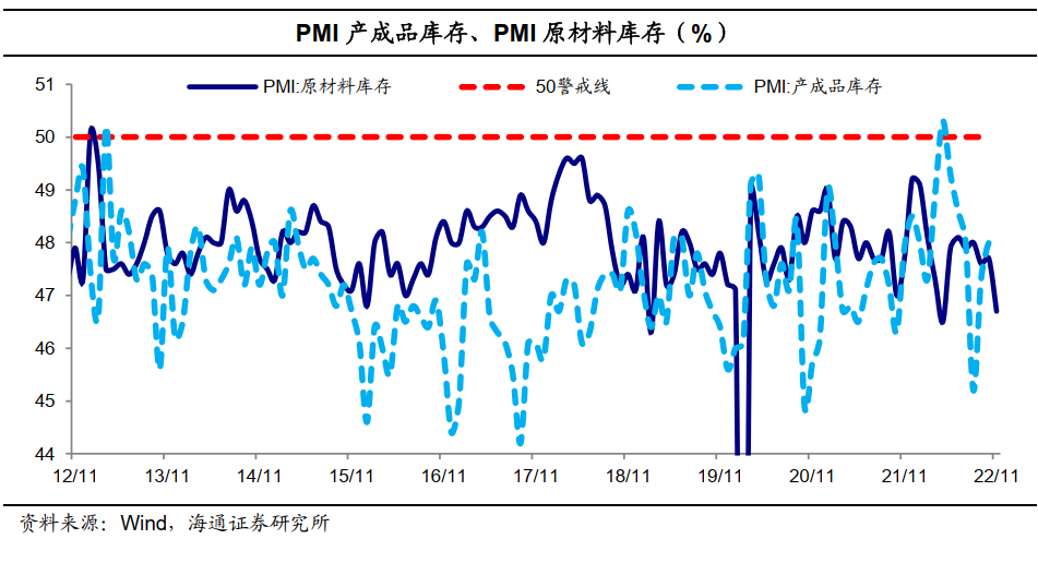 2)制造业PMI库存显示去库存意愿仍强从制造业PMI库存数据的趋势来看,除今年4月产成品库存PMI回升到50.3%之外,此后一直处于荣枯线下方,原材料库存PMI大多时候更是在48%及以下。10月工业企业利润下降,11月制造业PMI反季节性下降、产需两端PMI也均回落,当前企业去库存意愿依然较强。2.2 分行业看:库存去化空间仍在