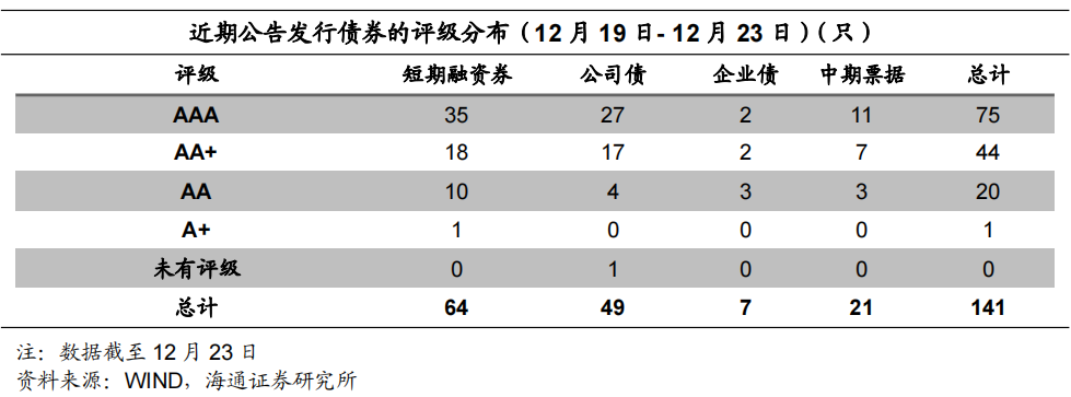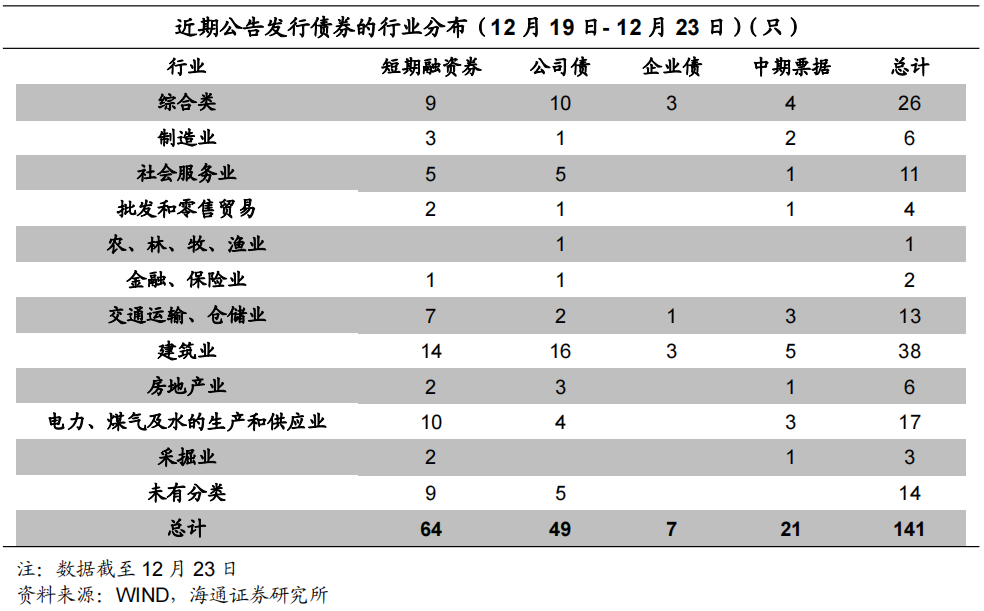 根据Wind统计,本周短融发行789.5亿元,到期1937.2亿元,中票发行220.8亿元,到期598亿元;企业债发行60.2亿元,到期140.3亿元;公司债发行367亿元,到期675.1亿元。本周主要信用债品种共发行1437.4亿元,到期3350.5亿元,净供给缺口为1913.1亿元,较前一个交易周(12月12日-12月16日)的728.9亿元缺口有所扩大。从主要发行品种来看,本周共发行短融超短融64只,中期票据21只,公司债发行49只,企业债发行7只,发行数量较前一周有所减少。从发行人资质来看,AAA等级发行人占比最大为53.19%。从行业来看,建筑业和综合类发行人占比最大,分别为26.95%和18.44%。![]()