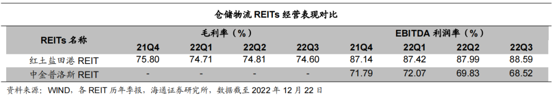 我国目前共有2只仓储物流类公募REITs:红土盐田港REIT和中金普洛斯REIT,均为首批募集发行,项目的收入来源主要为项目市场化出租获取的租金及综合管理服务费两部分。从项目分布区域看,红土盐田港REIT底层资产位于深圳市盐田区盐田综合保税区北片区,东临惠深沿海高速、南临盐排高速、西临盐田路、北临明珠大道,毗邻中国香港国际航运中心,深水岸线资源丰富,拥有海铁、水水、公水等多式联运,区位优势明显。中金普洛斯REIT底层资产分布于北京市、广州市、佛山市以及苏州市、昆山市的核心集散地,交通便利,周围工业厂房、物流仓库群聚,产业聚集度较高。从出租情况看,1)红土盐田港REIT的经营模式曾于2020年11月进行调整:2020年11月之前,基础设施项目由深圳市盐田港物流有限公司(以下简称“盐田港物流”)整租承包经营,再向客户提供转租和相关综合运营服务,包括固租、散租和提供一站式服务三种。2020年11月之后,基础设施项目由项目公司直接对外进行市场化招租,但散租客户需由盐田港承租物业后进行二次转租。从出租率看,自2020年起至2022年三季报,项目出租率始终维持在99%的良好水平。2)中金普洛斯REIT租约期限分布方面, 2021-2023年到期的租约占比分别为 32.44%,29.46%,23.75%。从承租客户行业看,截至2020年末,运输业占比 44.83%,商业与专业服务业占比 30.47%,软件与服务业占比 7.80%。从出租率看,截至2020年末,有5个物流园处于满租状态,2021年三季度至2022年三季度,各季末平均出租率为96.64%、98.78%、98.33%、94.56%、95.01%,存在一定波动。![]()