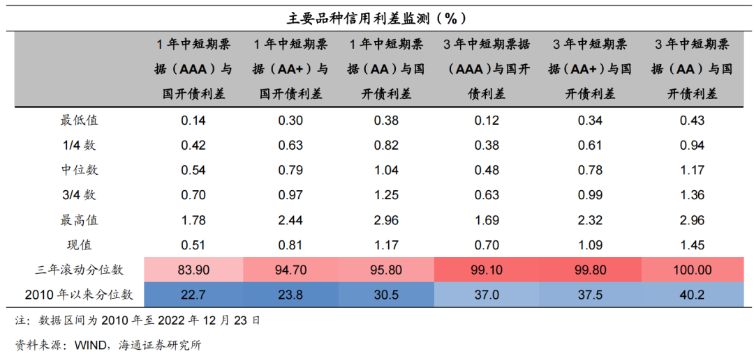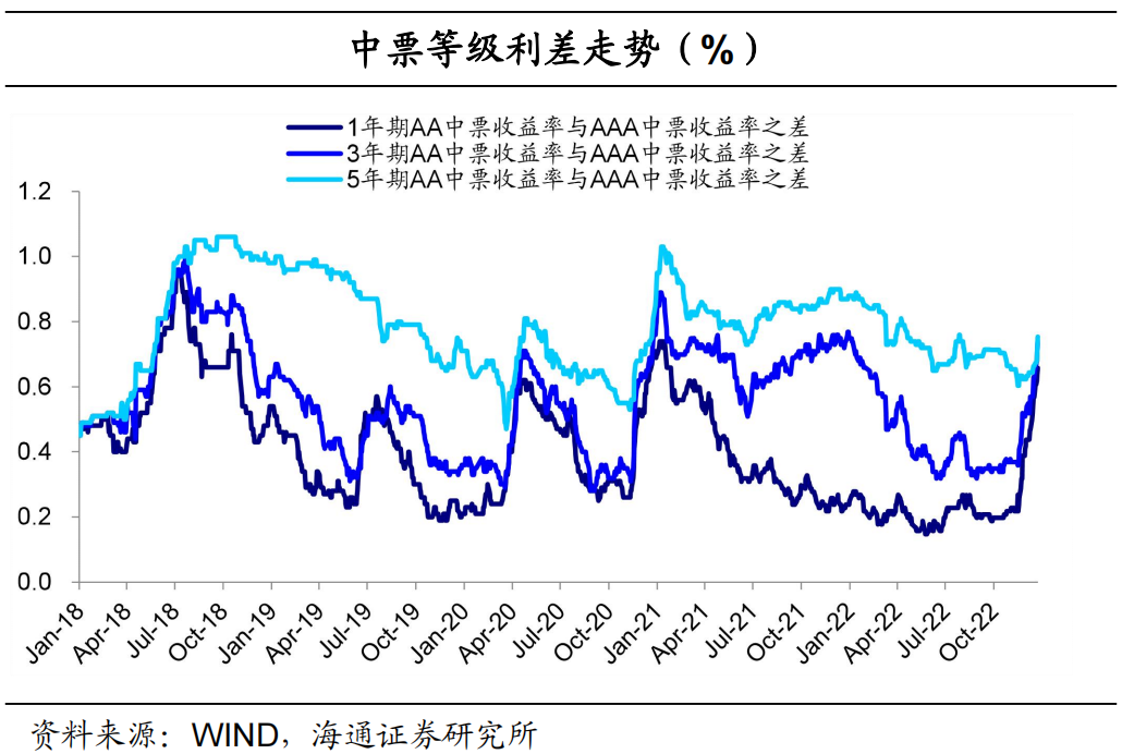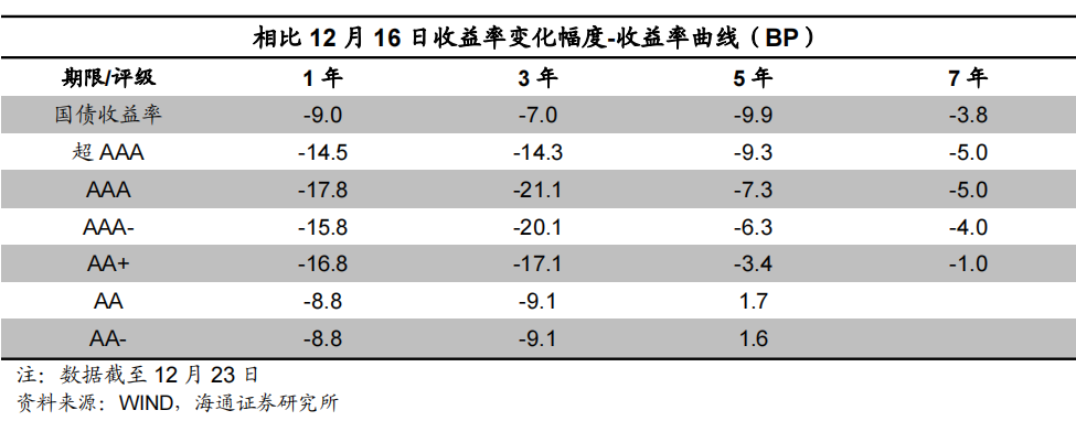 信用债等级利差走扩。具体来看,截至12月23日,1年期短期品种AA级与AAA级中票利差为66BP,较前一交易周末上行9BP,3年期AA级与AAA级中票利差为75BP,较前一交易周末上行12BP;5年期AA级与AAA级中票利差为75BP,较前一交易周末上行9BP。信用债期限利差走扩。具体来看,截至12月23日,5年期和3年期的AAA中票期限利差为29BP,较前一交易周末上行14BP;5年期和3年期的AA中票期限利差为30BP,较前一交易周末上行11BP;5年期和1年期AAA中票的期限利差为73BP,较前一交易周末上行10BP。![]()