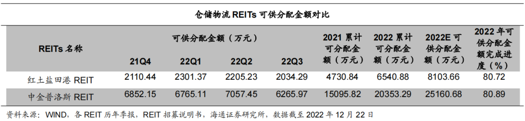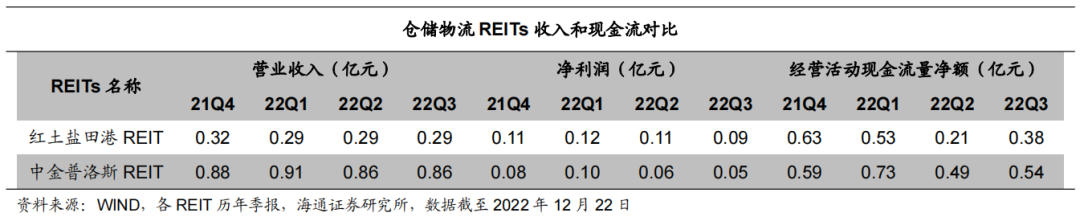 从经营表现看,仓储物流类REITs经营业绩受到疫情扰动的影响较小,收入确认较为平稳。截至2022年三季报,红土盐田港2022年营业收入完成进度79.35%,净利润完成进度87.36%,可供分配金额完成进度80.72%;中金普洛斯REIT单季度净利润确认速度有所放缓,2022年营业收入完成进度70.73%,净利润完成进度67.97%,可供分配金额完成进度80.89%。![]()