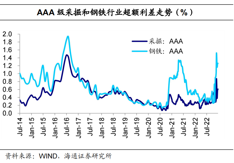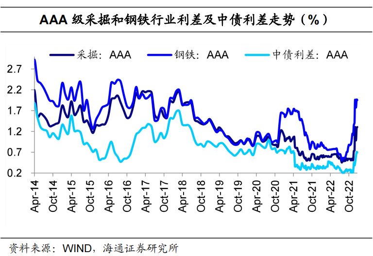 2.3 钢铁、采掘:行业利差分化,超额利差持平或走扩钢铁、采掘行业利差分化。具体来看,截至12月23日,AAA级钢铁债信用利差平均为196BP,较前一交易周末下行1BP;AAA级采掘债(主要是煤炭开采)信用利差平均为131BP,较前一交易周末上行2BP。钢铁、采掘超额利差持平或走扩。具体来看,截至12月23日,AAA级钢铁债超额利差为126BP,与前一交易周末持平;AAA级采掘债超额利差为61BP,较前一交易周末上行3BP。![]()