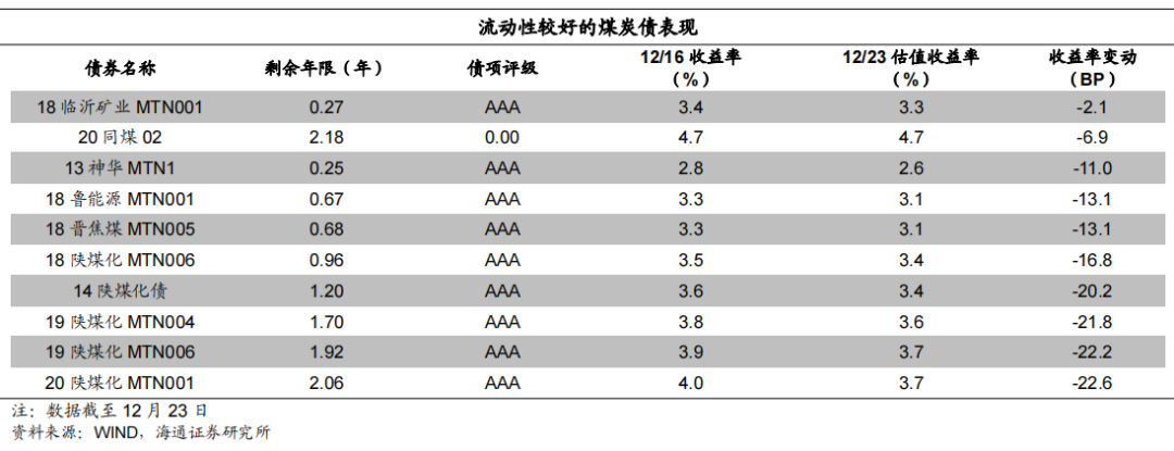 本周我们观测的煤炭债样本中,代表性债券的收益率整体下行。具体来看,18临沂矿业MTN001下行2.1BP,20同煤02下行6.9BP,13神华MTN1下行11BP,18鲁能源MTN001下行13.1BP,18晋焦煤MTN005下行13.1BP,18陕煤化MTN006下行16.8BP,14陕煤化债下行20.2BP,19陕煤化MTN004下行21.8BP,19陕煤化MTN006下行22.2BP,20陕煤化MTN001下行22.6BP。![]()